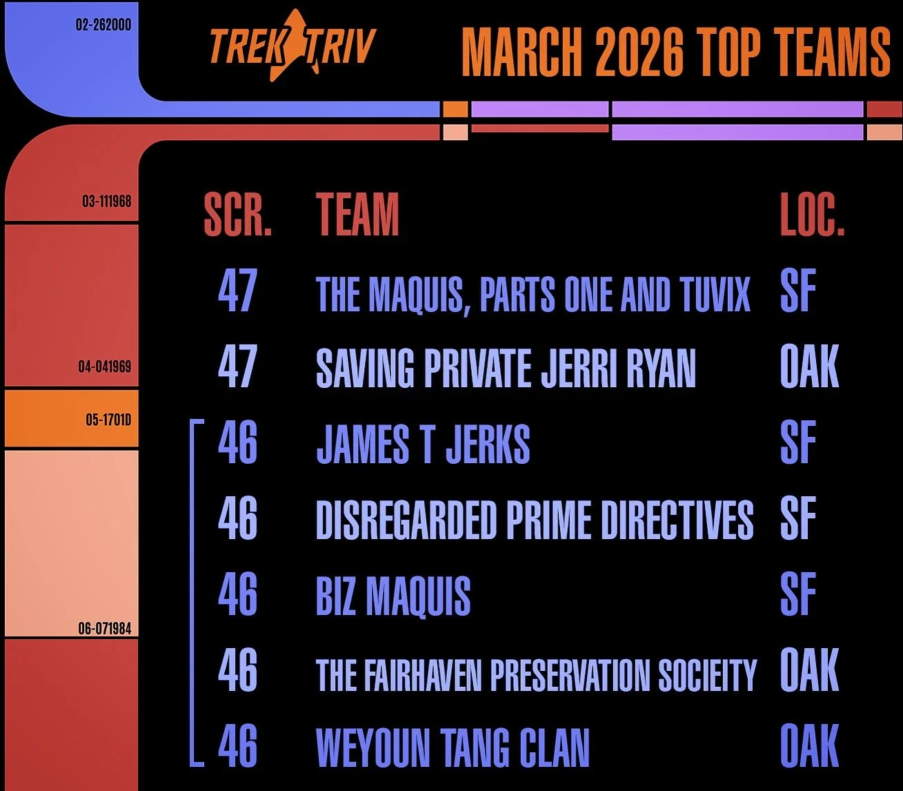 Hosted by Oliver Mains, Trek Triv produces and performs live Star Trek trivia events in the San Francisco Bay Area.